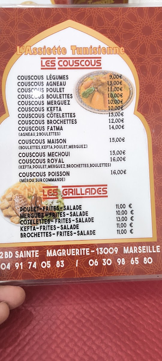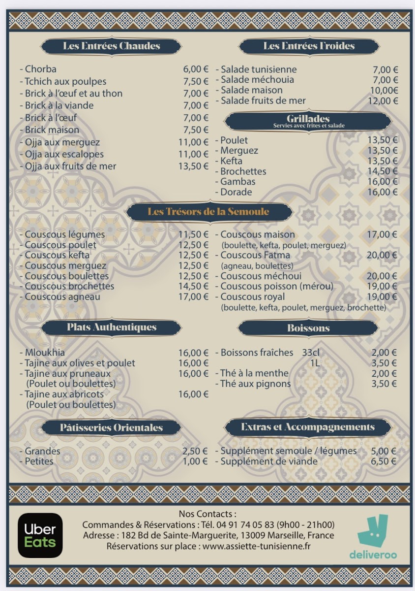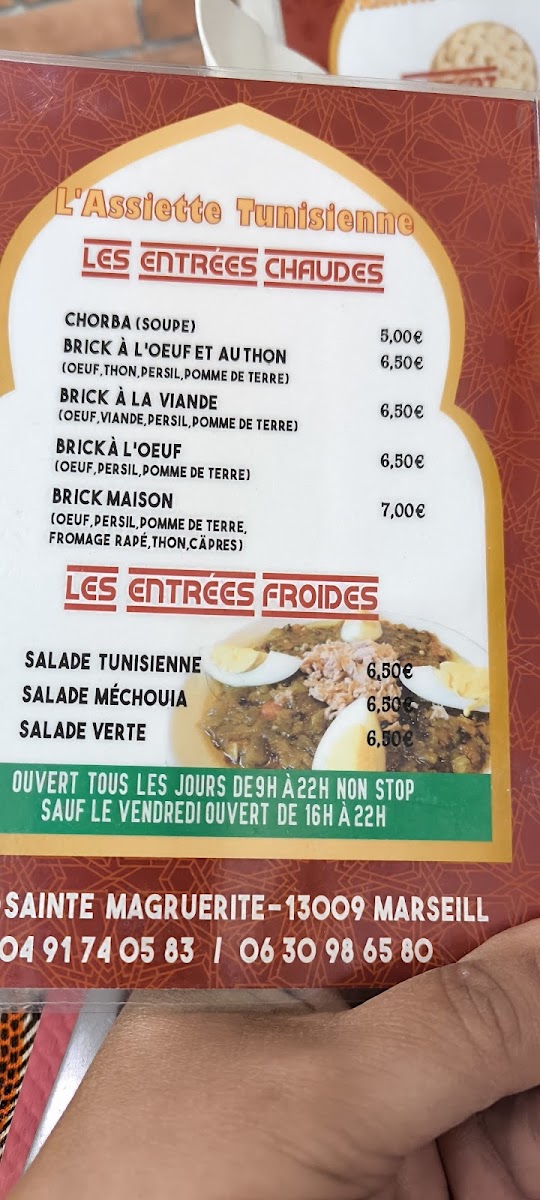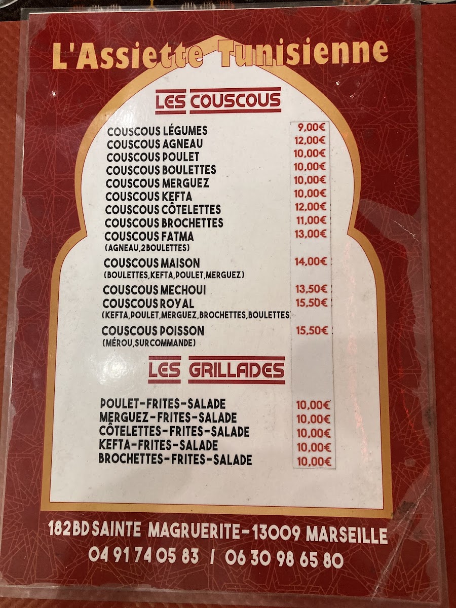 L'Assiette Tunisienne in Marseille offers an authentic journey through Tunisian cuisine with a menu that marries tradition and freshness. The warm entrées like Chorba, a fragrant lamb and vegetable soup, and the Tchich aux poulpes, featuring tender octopus in a rich, spiced broth, capture the soul of Mediterranean flavors. The crispy Brick à l’œuf, with its delicate balance of egg, parsley, and mashed potatoes wrapped in golden, flaky pastry, is a standout.